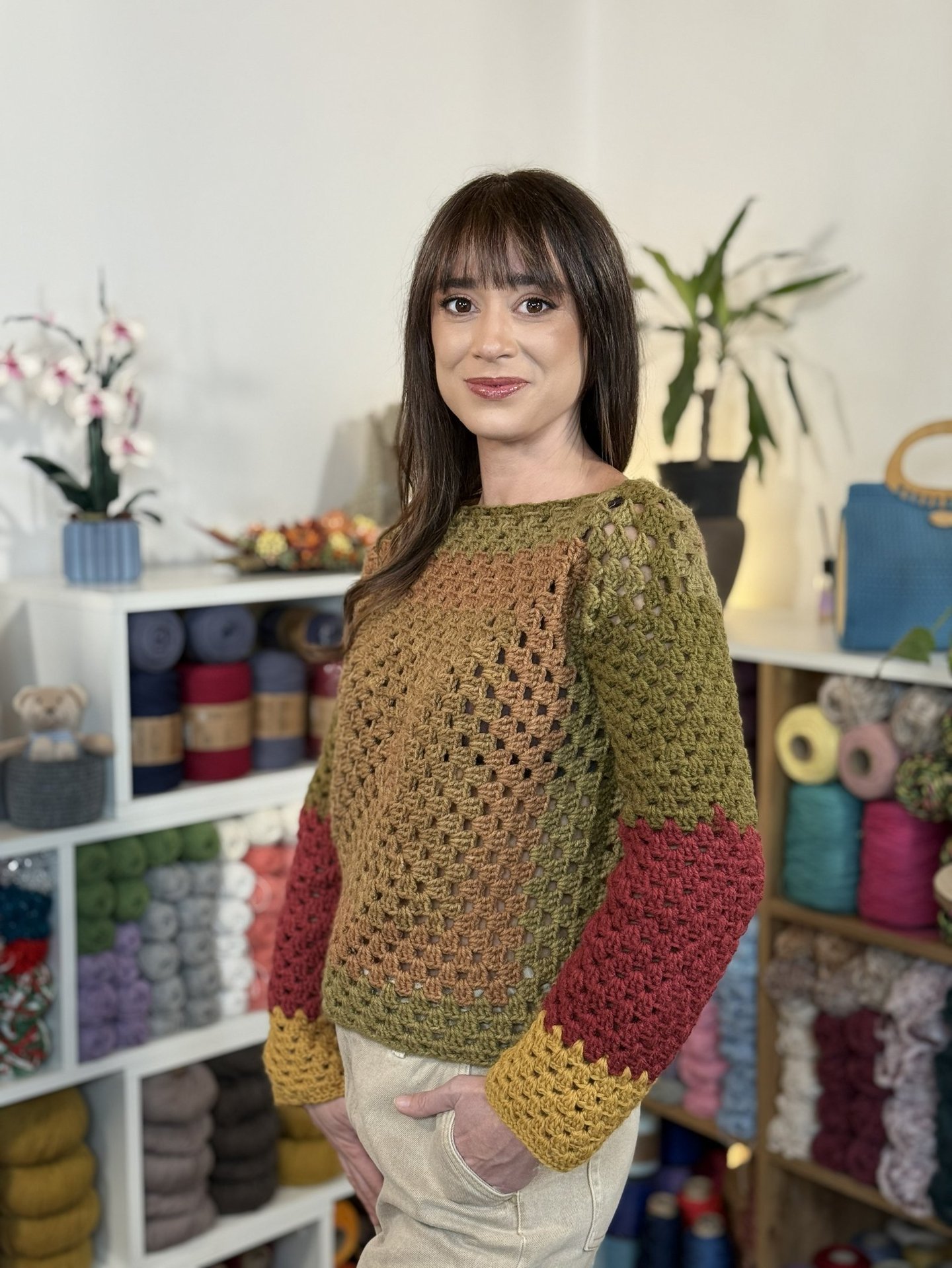 Imparerai a realizzare le mattonelle quadrate, a chiudere il giro in modo invisibile, a prendere le misure per adattare il maglione alla tua taglia, a creare le maniche con la tecnica granny in tondo e a rifinire il tutto con semplicità.